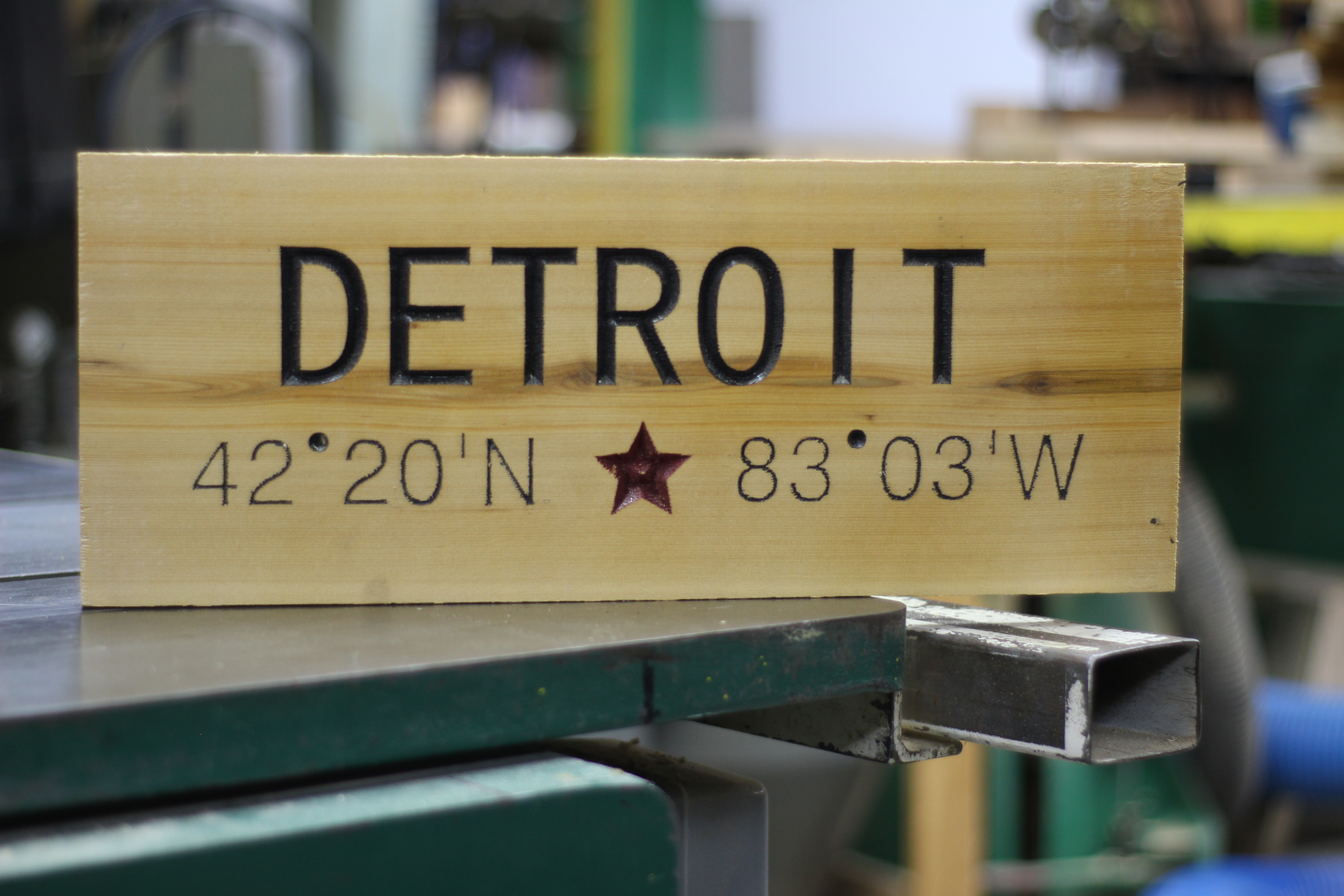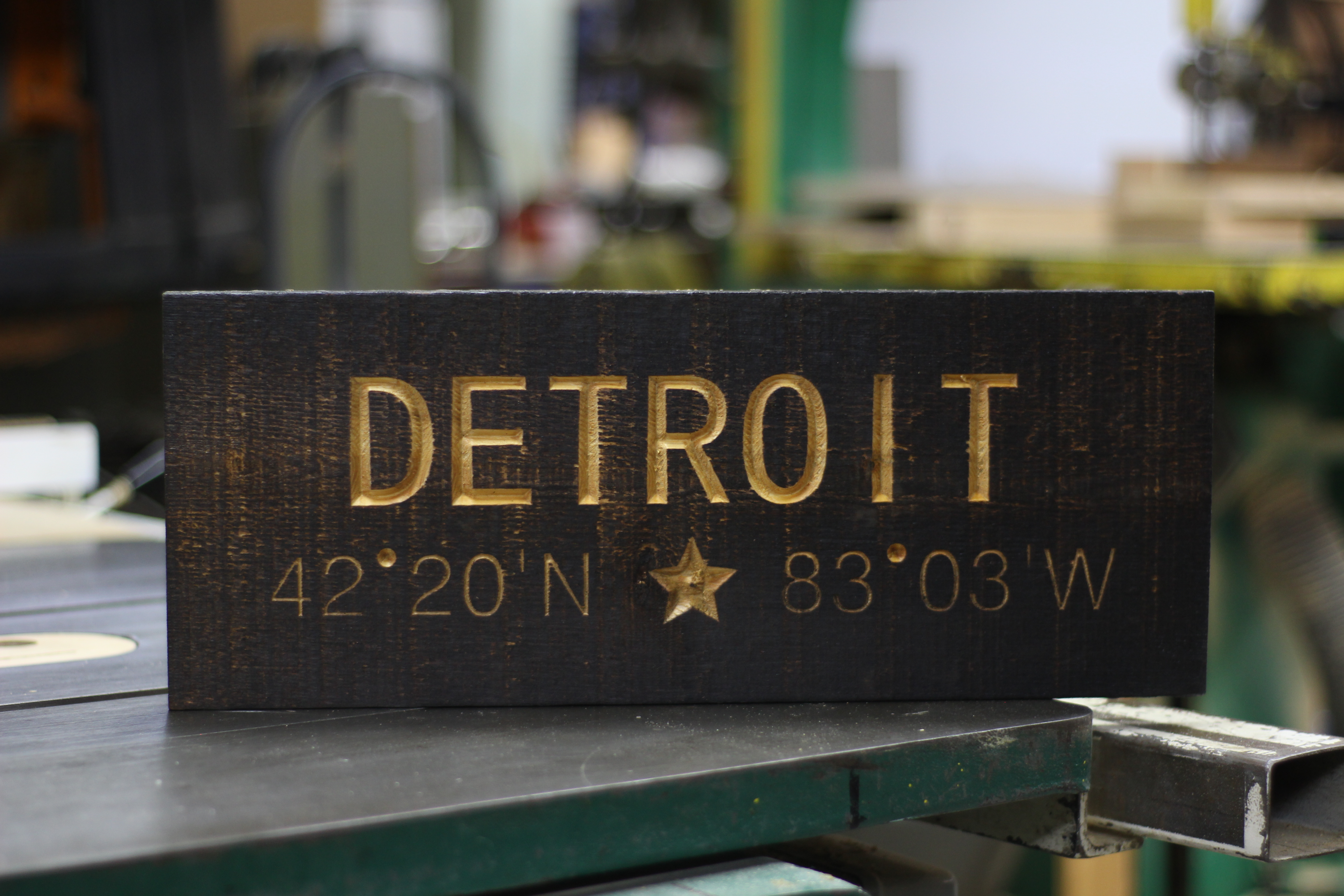 Detroit’s motto is “Speramus meliora; resurget cineribus,” which translates to “We hope for better things; it shall arise from the ashes.” The city’s motto was penned by Father Gabriel Richard after a terrible fire swept through Detroit on June 11, 1805. Latitude/Longitude in Degrees, Minuets, Seconds handmade out of Michigan Harvested Northern White Cedar Finished with a Natural Boiled Linseed Oil finish, in your choice of Natural or Shou Sugi Ban